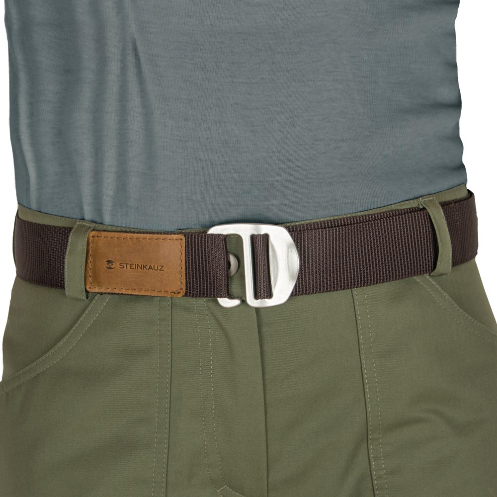 Der "Cargo" ist ein stabiler Outdoor-Gürtel aus 38 mm breitem Gurtband und einem eloxierten Aluminium-Hakenverschluss. Der Gürtel ist stufenlos verstellbar und ermöglicht damit einen gewissen Spielraum innerhalb der einzelnen Größen. Das Gurtband ist für lange Haltbarkeit am äusseren Ende verschweisst, doppelt eingeschlagen und vernäht. Die Schlaufe zum Einhängen in den Aluhaken ist zum besseren Einschlaufen mit Fettnubukleder verstärkt, das mit einem dezenten STEINKAUZ-Branding versehen ist. Durch den glatten, nach innen gekröpften Aluminiumhaken und die verstärkte Schlaufe lässt sich der Gürtel extrem leicht öffnen und schliessen, hat aber unter Spannung einen sicheren Halt. Auch das Verstellen der Weite am Körper ist ein schneller Handgriff. Ein robuster Allrounder, der besonders gut zu unseren Outdoorhosen passt aber auch an jeder anderen Hose eine gute Figur macht!