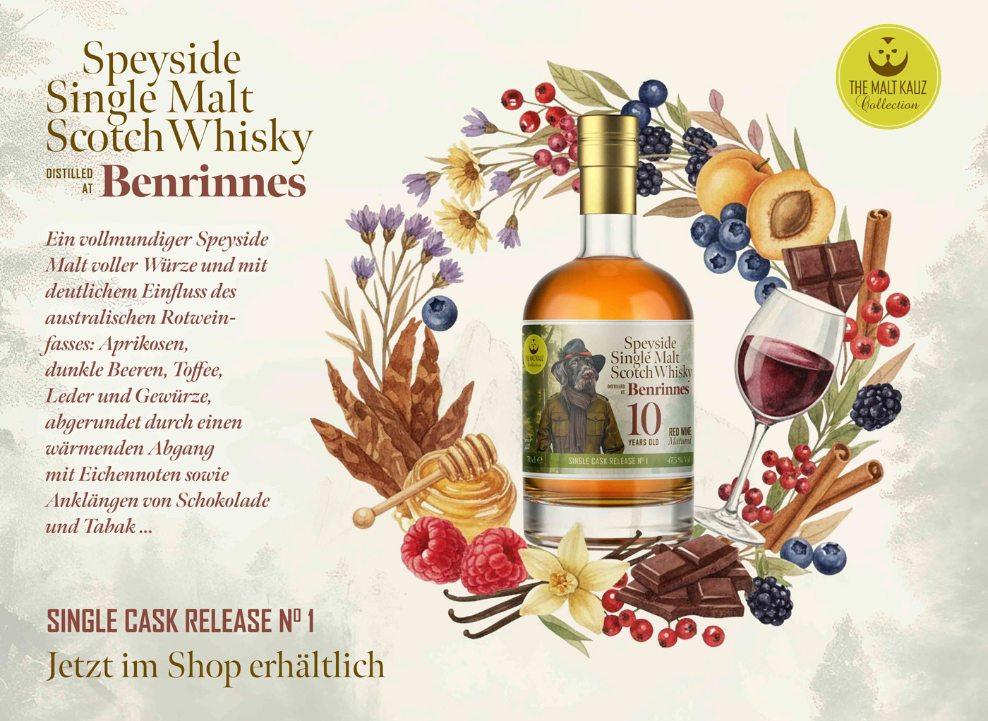 Ein 10-jähriger Single Malt aus der Brennerei Benrinnes eröffnet die Reihe von THE MALT KAUZ. Diese Einzelfass-Abfüllung reifte vollständig in einem First Fill Australian Red Wine Cask – eine seltene Kombination, die dem Tropfen eine eindrucksvolle Balance aus Kraft, Frucht und Tiefe verleiht. Die Benrinnes Distillery im Herzen der Speyside ist bekannt für ihre kraftvollen, vielschichtigen Malts mit würziger Tiefe und malziger Fülle. Die Reifung im australischen Rotweinfass spendierte dem Speysider reichhaltige Noten von Früchten und Gewürzen, sowie feine Tannine und eine samtige Süße.