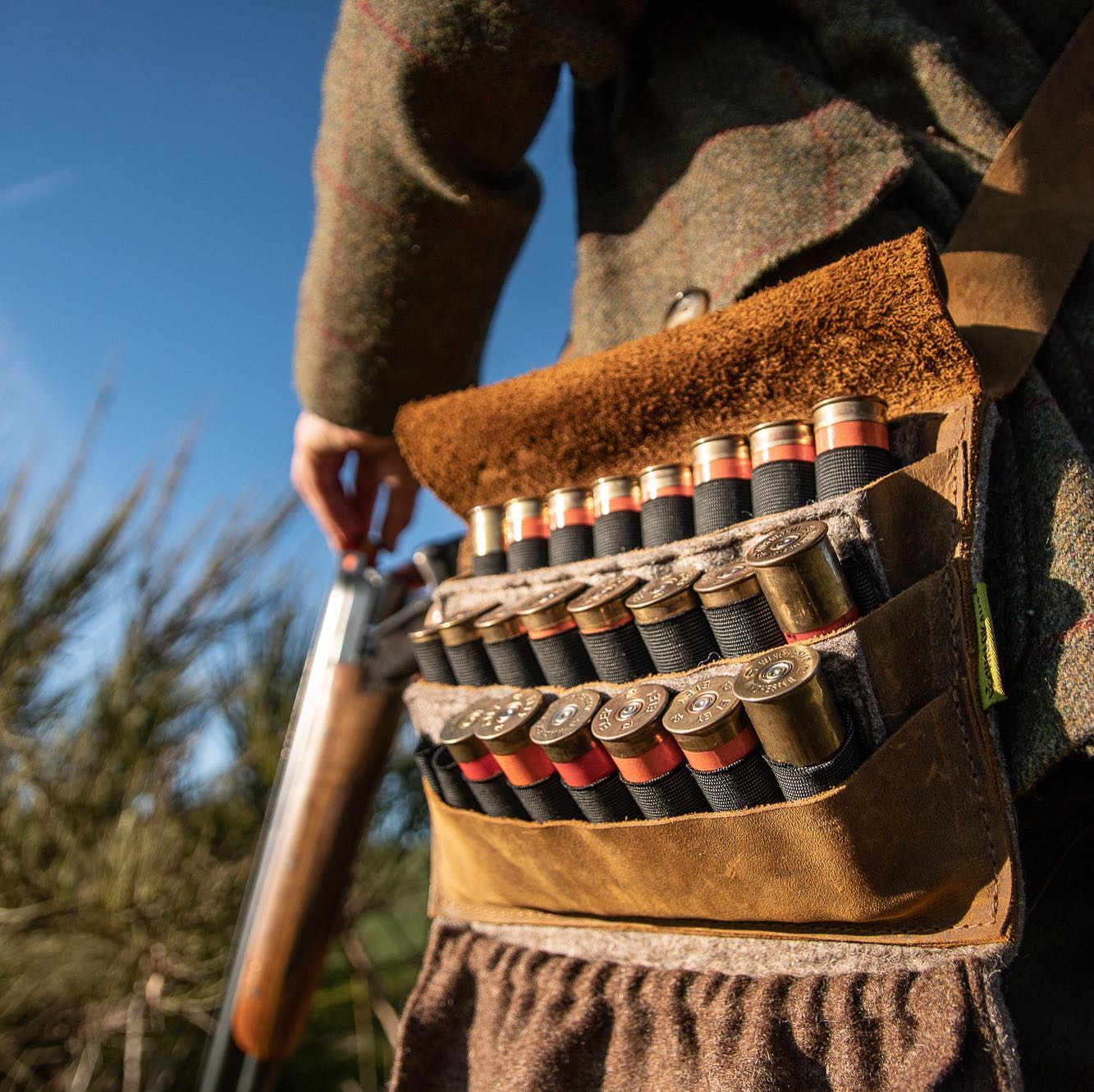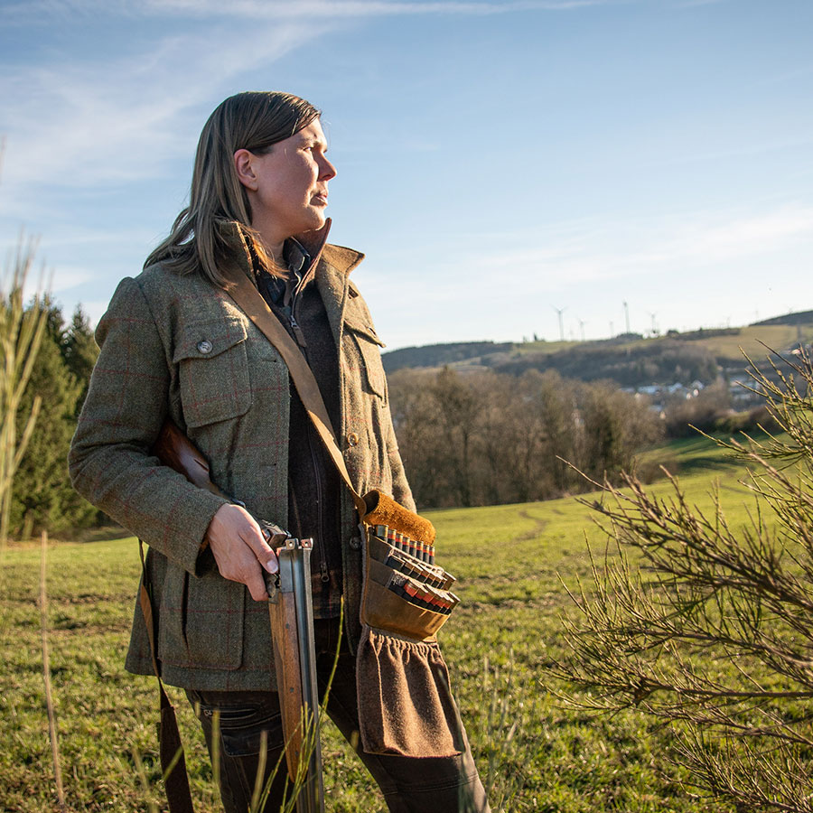 Practical ammunition bag for small game hunting with a shotgun and for the shooting range Dual system with loops for fresh ammunition and a waste bag All authentic: Loden and felt made from 100% pure virgin wool and naturally genuine leather Comfortable fit on the body Cartridges are protected even when the bag is open due to the pocket cover Very appealing design Handcrafted in proven WALDKAUZ quality Material composition: Outer material: 100% pure virgin woolStrap: Oiled nubuck leatherElastic band: 100% polyesterContains non-textile parts of animal origin (leather) WALDKAUZ Shotgun Cartridge Bag During an eventful shotgun hunt, it often becomes disorganized: more and more empty shells spread out in jacket pockets or the classic small game hunting bag, making it difficult to find fresh ammunition. With the WALDKAUZ Shotgun Cartridge Bag, that's a thing of the past because we have a dual system! When closed, the bag appears like a normal, small game hunting bag. However, when opened with a pull on the closure strap, the uniqueness of our latest development is revealed: the bag unfolds, and immediately twenty-four shotgun shells are fanned out in three neat rows, readily accessible. The spent cartridges land in the underlying loden sack, which securely holds the discarded shells with a light elastic drawstring. Cleaning up after the hunt is also easier because full and spent ammunition are already cleanly separated. The bag is made of wool felt, loden, and leather. Even in the open position, the lid acts as a canopy over the ammunition, protecting it from precipitation. The ergonomic shape and placement of the carrying strap promote a comfortable fit, even after hours of use.