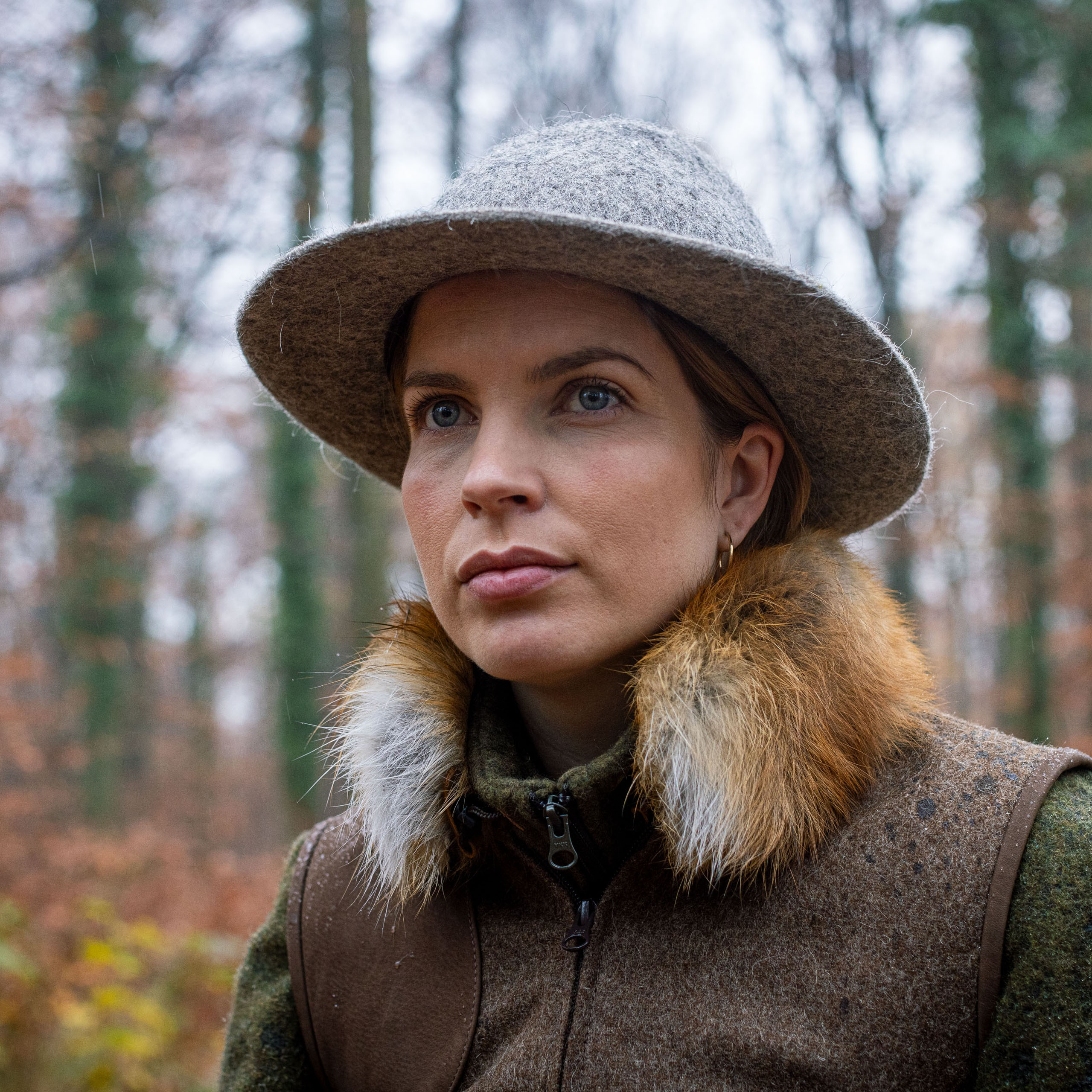 Our WALDKAUZ loden vest is made of high-quality loden fabric from pure virgin wool. It is trimmed with soft nappa leather on the collar, armholes, pockets, and shoulders. Whether on the hunt or at the shooting range, you are well equipped for a safe shot with the large pockets for shotgun ammunition and the leather shoulder patch. The vest can be adjusted and tailored with genuine buffalo horn buttons on the side tabs, depending on whether you wear a sweater in winter or a blouse or shirt in the transitional seasons. The colorful combination also makes the loden vest perfect for everyday wear. Our high-quality loden is a classic, stylish, and above all warm material. And since loden is very durable, you can use your loden hunting vest in various ways. Small stains can simply be brushed off. The vest features a detachable collar made of genuine red fox fur. The foxes used for our collars come exclusively from hunting and are not farm-raised foxes. We work closely with German tanners and fur traders who receive pelts from hunters in their region.