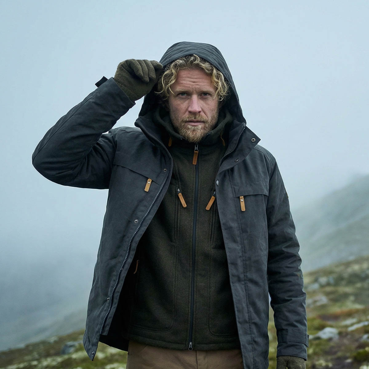 Das Innere der „Windfang“ ist mit einem dünnen Taschenfutter aus Polybaumwolle ausgekleidet, damit der gewachste Oberstoff keinen direkten Kontakt mit der übrigen Kleidung hat. Die Kapuze ist mit dem innen liegenden Kordelzug über zwei Achsen an die Kopfform anpassbar und lässt sich von locker bis eng anliegend tragen. Vier Außentaschen, zwei im Brust- und zwei mit seitlichem Eingriff im Hüftbereich, sind alle mit Reißverschluss versehen und zusätzlich mit einem Übertritt aus Waxcotton ausgestattet, der das Eindringen von Regentropfen erschweren soll. Im Inneren befindet sich auf beiden Seiten ebenfalls im Brustbereich je eine weitere Innentasche mit Reißverschluss und seitlichem Eingriff. Der Hauptreißverschluss ist aus brüniertem Metall und gleich mit zwei Stegen versehen, die unter und über dem Reißverschluss Wind- und Regen ausbremsen. Im Inneren der Ärmelbündchen und im Bund des Rumpfes sind Windfänge eingebaut. Das sind Stoffmanschetten, die mithilfe eines Kordelzuges verengt werden können, um das Eindringen von kaltem Wind zu verhindern und so die Jacke zusätzlich an empfindlichen Stellen abzuschotten. Darüber hinaus können die Ärmelbündchen auch noch mit einem außen liegenden Klettband enger gestellt werden.Hergestellt aus nachhaltigen Materialien